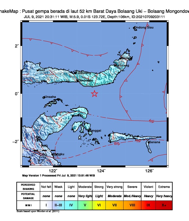 Badan Meteorologi, Klimatologi dan Geofisika (BMKG) melaporkan parameter gempa M5,9 berpusat 52 km barat daya Kecamatan Bolaang Uki, Bolaang Mongondwo Selatan dengan kedalaman 106 km. Titik pusat gempa berada di laut.