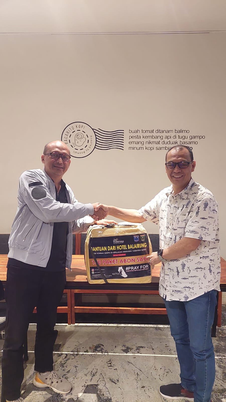 DIREKTUR Hotel Balairung Buchari Bachter (kiri) menyerahkan bantuan kepada korban Gempa Mentawai melalui mantan Bupati Mentawai Yudas Sabanggalet, Jumat (28/4) di Padang. (foto : BB)