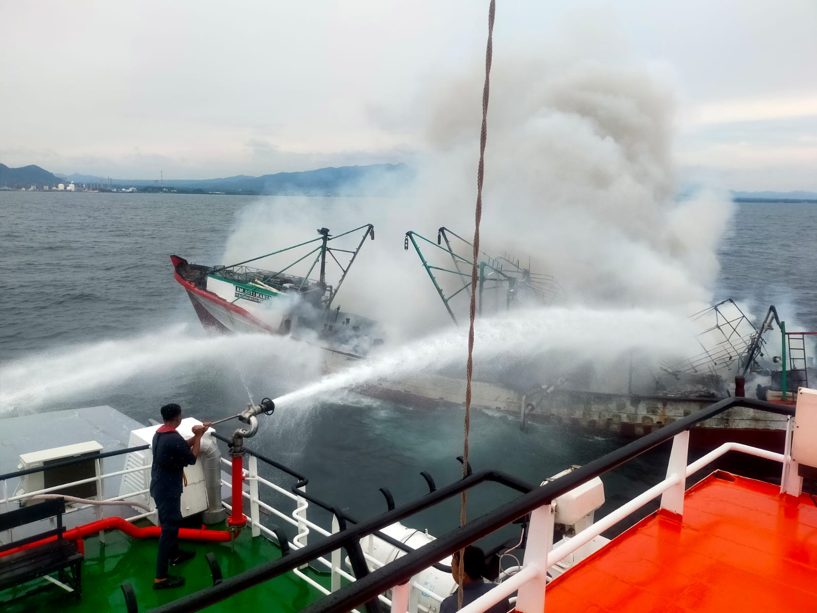 Kapal patroli tiba di posisi KM Inti Marina VII pada pukul 14.15 WIB dan langsung melaksanakan upaya pemadaman secara intensif dan terukur.