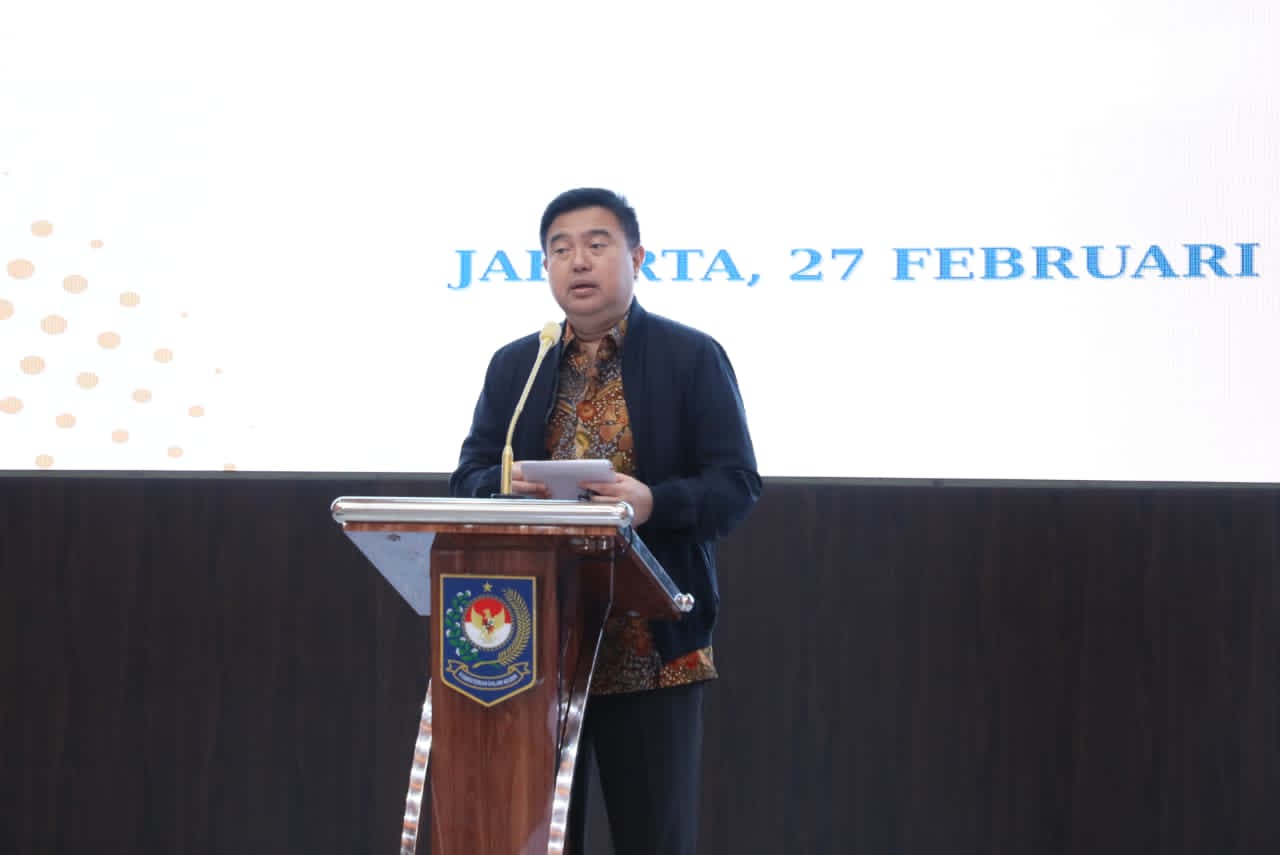 Sekjen Kemendagri Tomsi Tohir memberikan sambutan padacRakor Penurunan Kemiskinan, Pengangguran, Pengelolaan Lingkungan yang ASRI, dan Penguatan Tata Kelola Penyelenggaraan Pemerintahan di Gedung Sasana Bhakti Praja (SBP), Kantor Pusat Kemendagri, Jakarta, Jumat (27/2/2026). (Foto : Puspen Kemendagri)