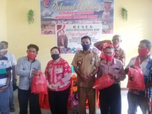 RESES -Ketua DPRD alor Enny Anggrek sedang menyerahkan bantuan sembako dan masker saat reses ke Kelurahan Kalabahi Barat, Selasa (16/6). (Foto : AK)