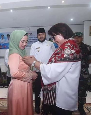 Wakil Ketua KPK Basaria Panjaitan sematkan Pin kepada istri Wako Padang Panjang. Humas