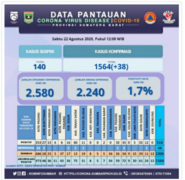 Sehari sebelumnya, Sabtu (22/8) total warga Sumbar yang positif Covid -19 sudah mencapai 1.564 orang dengan penambahan pasien positif baru sebanyak 38 orang.