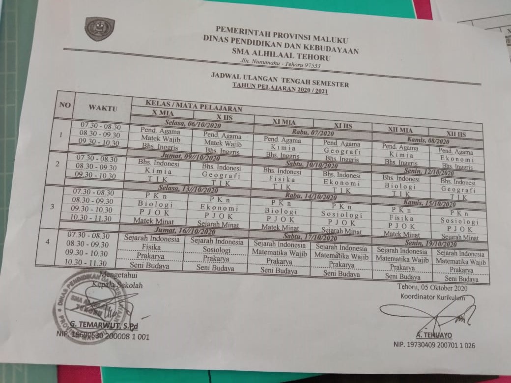 MALUKU – SMA Al Hilaal Tehoru sedang melaksanakan Penilaian Tengah Semester . PTS dilaksanakan dari hari Senin tanggal 6 Oktober sampai dengan hari Senin tanggal 19 Oktober 2020.