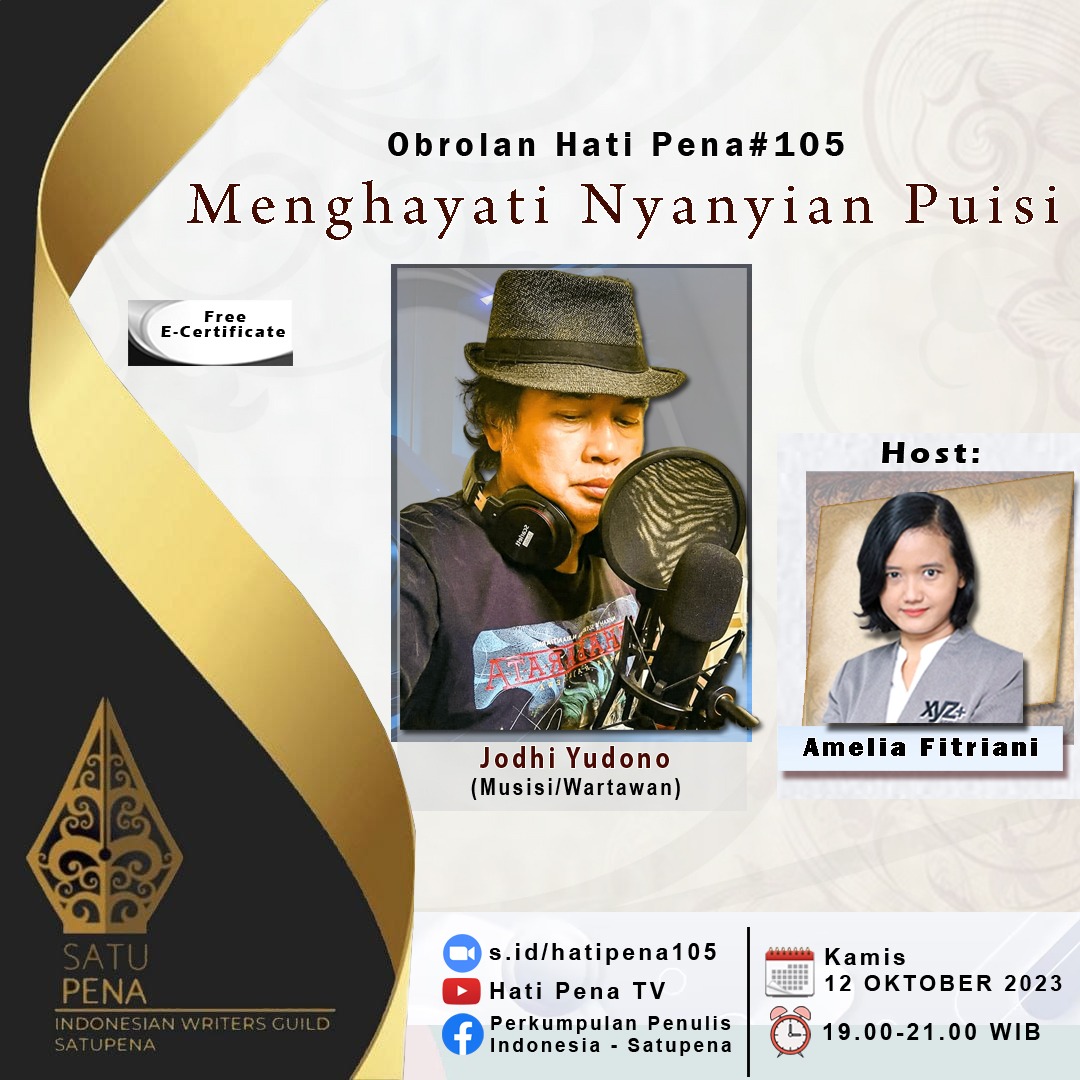 Obrolan Hati Pena #105 tentang Menghayati Nyanyian Puisi itu akan berlangsung di Jakarta pada Kamis malam, 12 Oktober 2023, pukul 19.00-21.00 WIB.