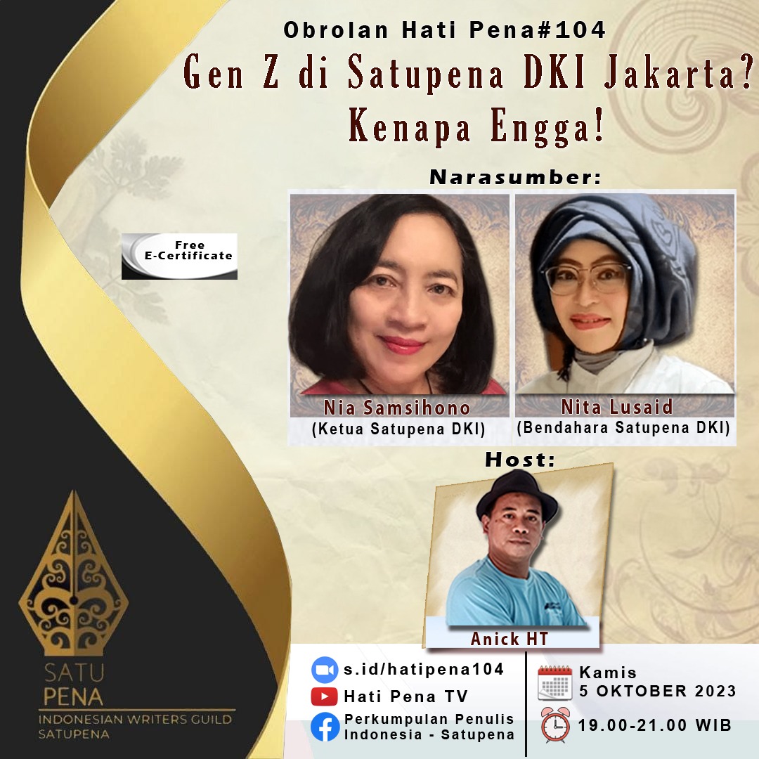 Pembicara di diskusi gelora literasi dan peran gen Z itu adalah Nia Samsihono, Ketua Satupena DKI, dan Nita Lusaid, Bendahara Satupena DKI. Diskusi itu akan dipandu oleh Anick HT.