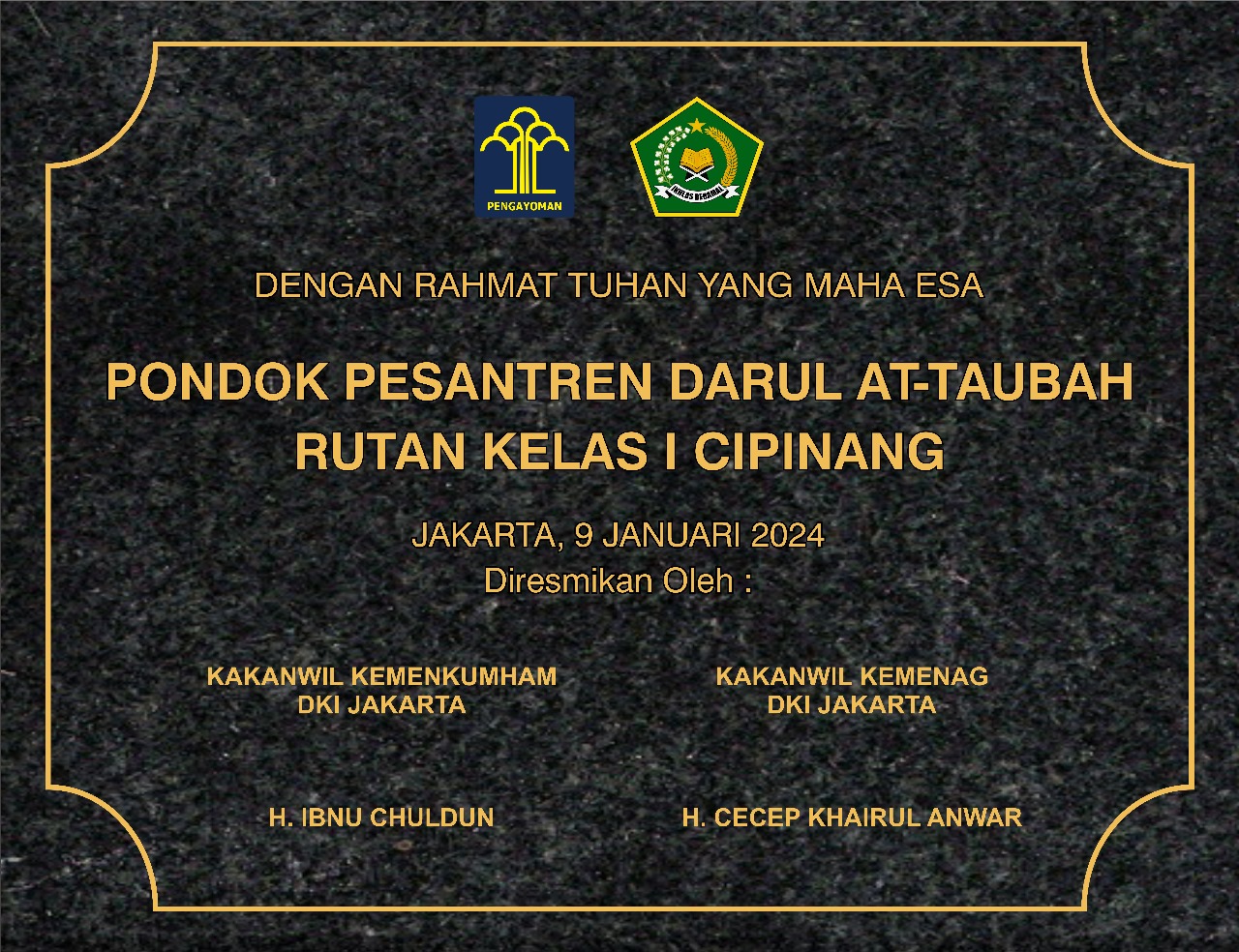Peresmian pembangunan pesantren Darul At Taubah itu dilaksanakan oleh Kepala Kanwil Kemenkumham DKI Jakarta Ibnu Chuldun bersama Kepala Kanwil Kemenag DKI Jakarta Cecep Khairul Anwar, Selasa 9 Januari 2024.