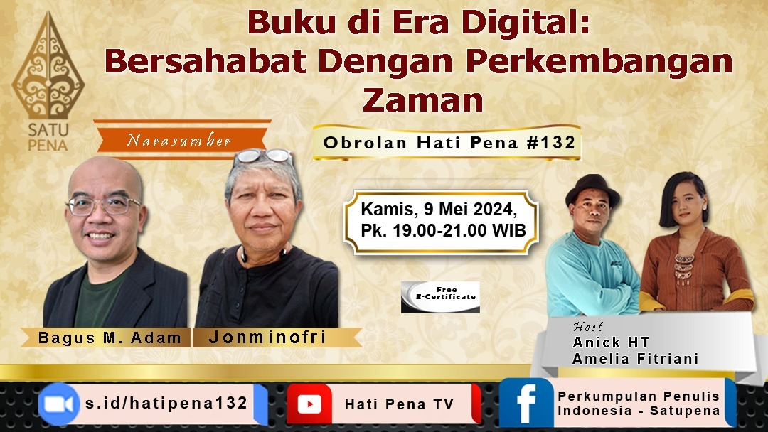 Obrolan Hati Pena #132 tentang buku di era digital itu akan berlangsung di Jakarta, Kamis, 9 Mei 2024, pukul 19.00-21.00 WIB.