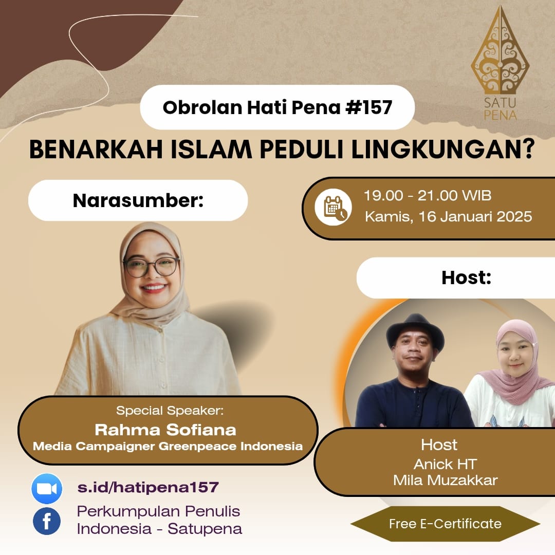 HARAIANINDONESIA.ID – Perkumpulan Penulis Indonesia SATUPENA akan mendiskusikan tentang Islam kepedulian lingkungan dengan narasumber Rahma Sofiana, Media Campaigner Greenpeace Indonesia.