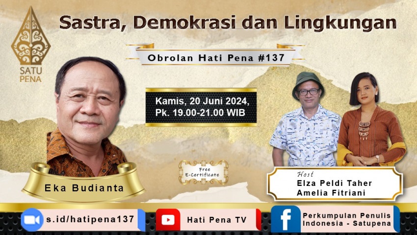 Obrolan Hati Pena #137 tentang sastra, demokrasi, dan lingkungan kebudayaan itu akan berlangsung di Jakarta, Kamis, 20 Juni 2024, pukul 19.00-21.00 WIB.