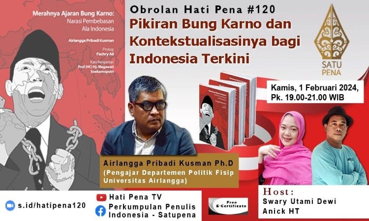 Kali ini SATUPENA menghadirkan Airlangga Pribadi untuk berdiskusi tentang bukunya, dan kontekstualisasi gagasan Bung Karno hari ini.