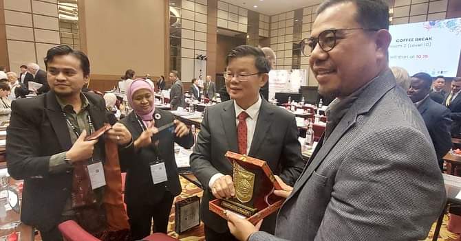 Keterangan Foto : Tuan Chow Kon Yeow, Chief Minister of Penang saat menerima plakat logo Kota Sawahlunto dan penyerahan sal songket Silungkang dari PJ.Wako Zefnihan (Foto : Ist)