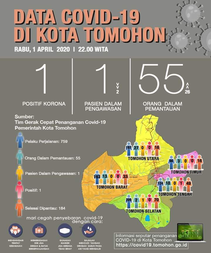 Hal itu dibenarkan pula oleh Kepala Dinas Kesehatan Kota Tomohon, dr. Deesje Liuw MBiomed. Menurutnya wanita positif Corona ini memiliki Kartu Tanda Penduduk (e- KTP) Tomohon, akan tetapi bekerja di luar Kota Tomohon. “Betul pasien ini KTP Tomohon tapi kerja di luar daerah, dan selama sakit tidak pernah datang ke Tomohon. Saat ini pasien dirawat di RSUP Prof Kandouw. Terkait langkah-langkah, dilaksanakn sesuai SOP, mulai kedatangan sampai dirawat. Untuk orang yang ada kontak, telah diisolasi, dipantau bahkan diperiksa. Menurut RS Kandow, pasien tersebut sudah stabil dan mengarah ke yang lebih baik. Terang Kadis. (Handry)
