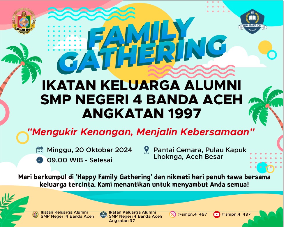 Dengan hormat, panitia juga mengundang Pengurus IKA SMPN 4 Banda Aceh, guna memberikan dukungan dan semangat bagi alumni angkatan 1997 yang tengah melaksanakan momen bersejarah ini.