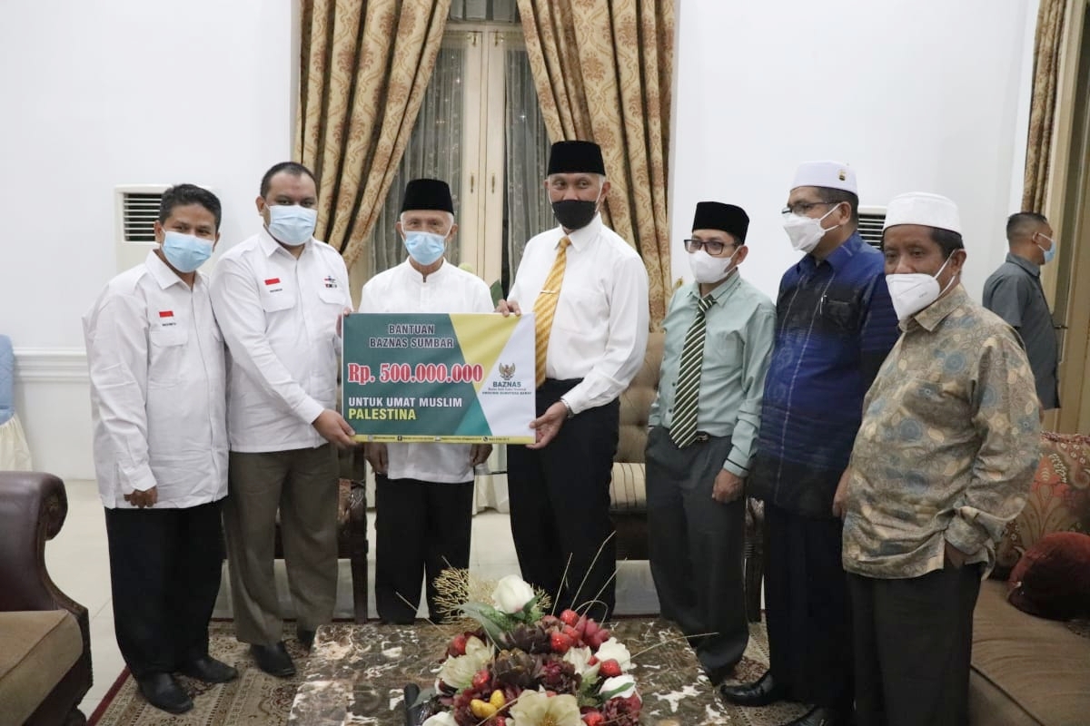 PADANG – Gubernur Sumbar Mahyeldi Ansharullah menyerahkan bantuan dari Badan Amil Zakat (Baznas) Provinsi Sumatera Barat senilai Rp500 juta bagi warga Palestina, melalui Komite Nasional Rakyat Palestina (KNRP).