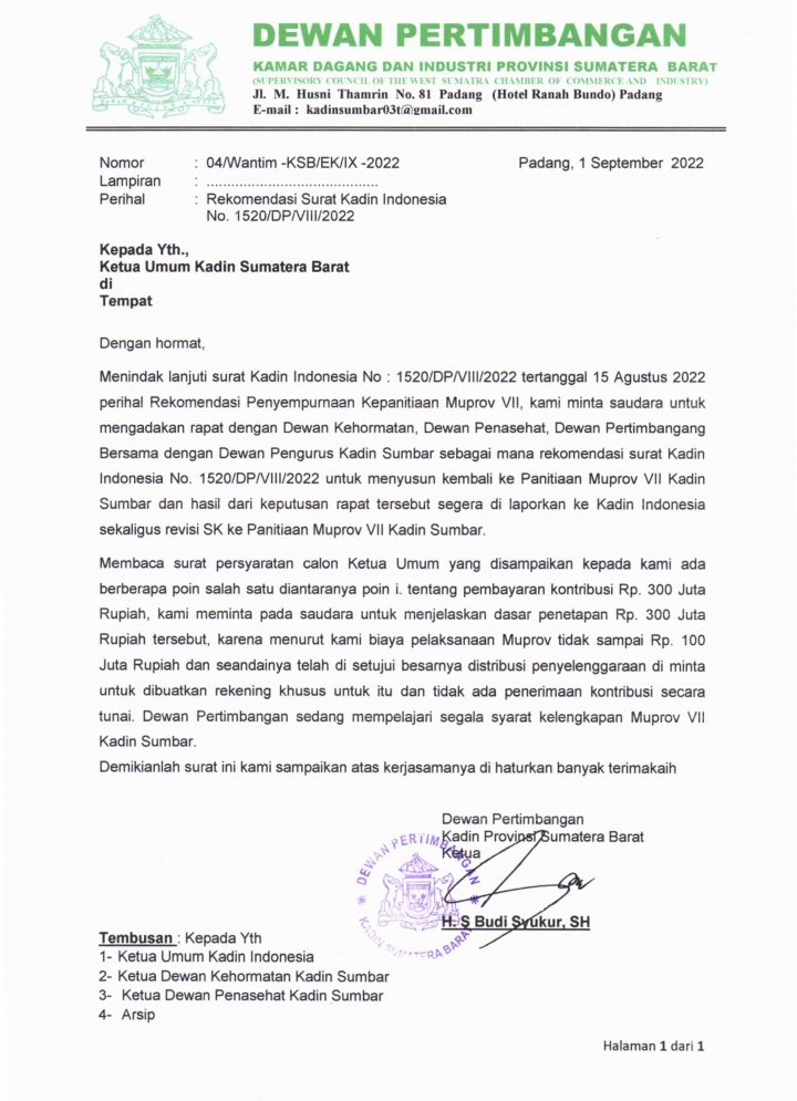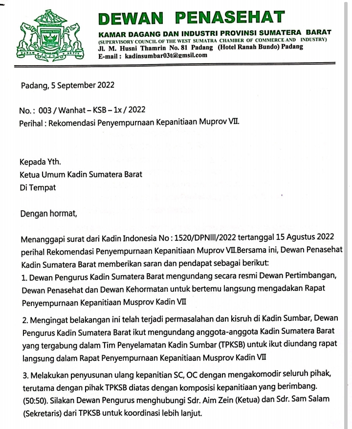 Kedua Ketua Dewan di Kadin Sumbar itu di dalam surat masing masing menagih Ramal Saleh untuk menata ulang kepanitiaan Musprop sesuai amanat surat Kadin Indonesia No 1520 tertanggal 15 Agustus 2022. Di dalam surat Kadindo itu memang merekomendasikan menyusun ulang kepanitiaan Musprop VII.