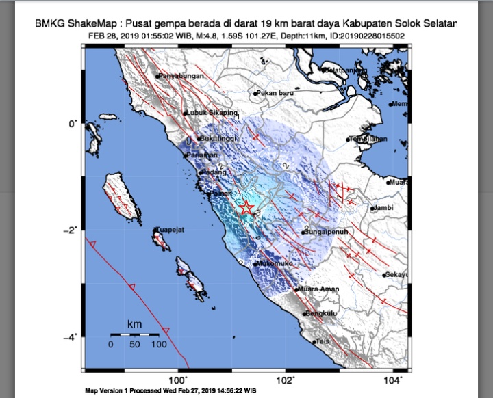 • Hari Kamis, tanggal 28 Februari 2019, pada pukul 01.55.02 WIB, wilayah Solok Selatan diguncang gempabumi tektonik. Hasil analisis BMKG menunjukkan informasi gempabumi ini berkekuatan M=4.8. Pusat gempabumi ini berada di darat pada koordinat 1,59 Lintang Selatan dan 101.27 Bujur Timur, tepatnya 19 kilometer Barat Daya Kab.Solok Selatan, pada kedalaman 11 kilometer.
