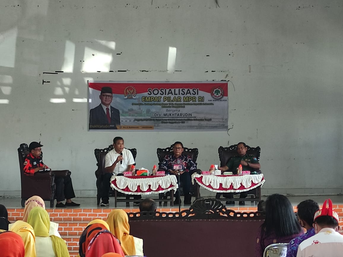 BUNTOK – Anggota DPR/MPR – RI Dapil Kalimantan Tengah (Kalteng) Drs. Mukhtarudin, lakukan kegiatan Sosialisasi Empat Pilar MPR RI, yakni; Pancasila sebagai dasar dan Ideologi Negara, UUD Negara Republik Indonesia Tahun 1945 sebagai Konstitusi Negara serta Ketetapan MPR RI, NKRI sebagai bentuk Negara dan Bhineka Tunggal Ika sebagai semboyan Negara