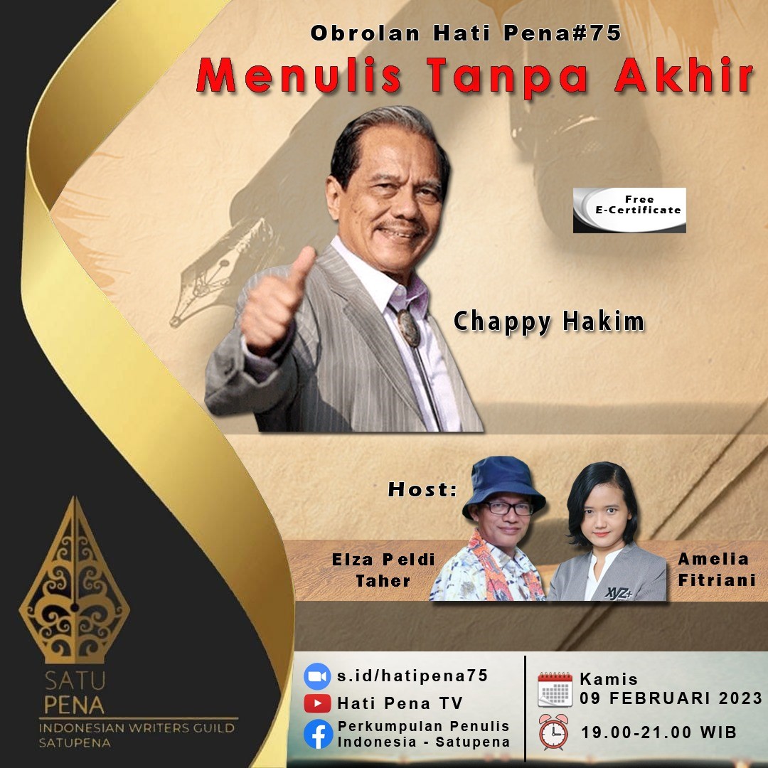 Obrolan Hati Pena #75 tentang Chappy Hakim dan produktivitas sebagai penulis itu akan diselenggarakan di Jakarta pada Kamis, 9 Februari 2023, pukul 19.00-21.00 WIB.