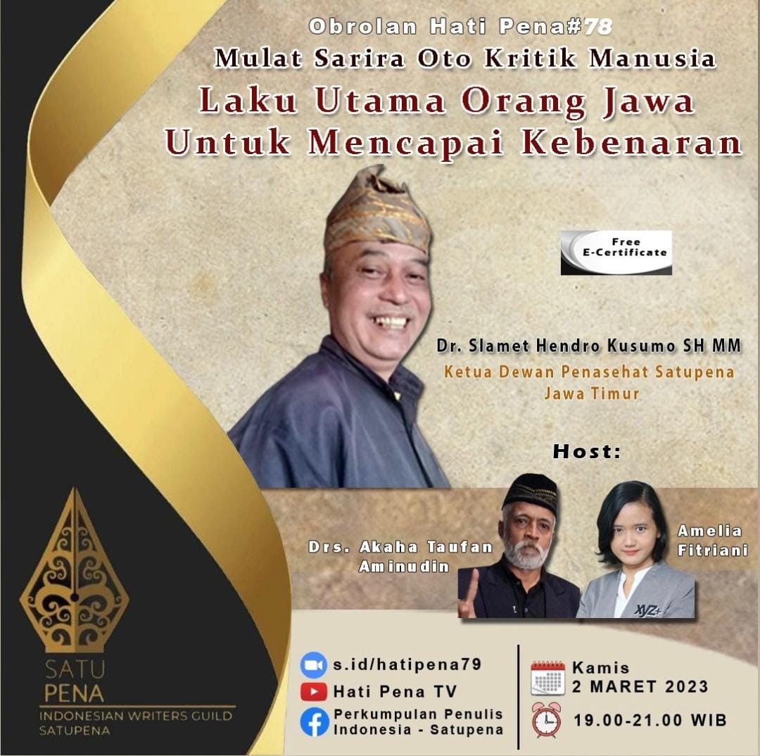 Obrolan Hati Pena #78 tentang Laku Utama Orang Jawa itu akan diadakan di Jakarta pada Kamis, 2 Maret 2023, pukul 19.00-21.00 WIB.