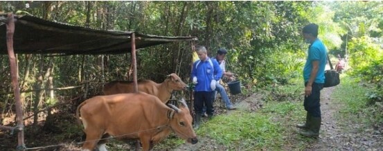 Tim dari Puskeswan Tamiang Layang, Dudi Prahma, S.Pt dan Ketua KTNA Kecamatan Paju Epat, Arbahawino turun lapangan lansung meninjau ternak milik kelompok Tani Ternak di Desa Telang.