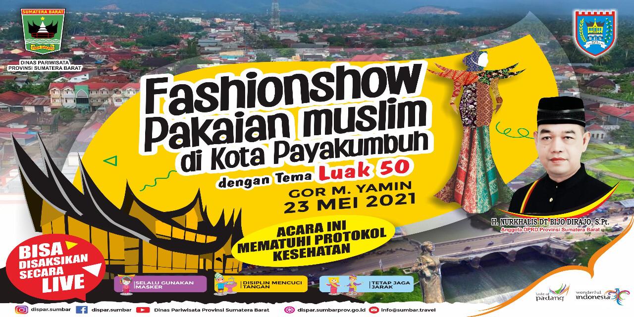 PAYAKUMBUH – Dinas Pariwisata Provinsi Sumatera Barat akan menggelar kegiatan Payakumbuh Fashion Show Pakaian Muslim 2021 bertema Luak 50 yang diselenggarakan pada Minggu, 23 Mei 2021, bertempat di Gedung Olah Raga M Yamin, Kubu Gadang, Kota Payakumbuh.