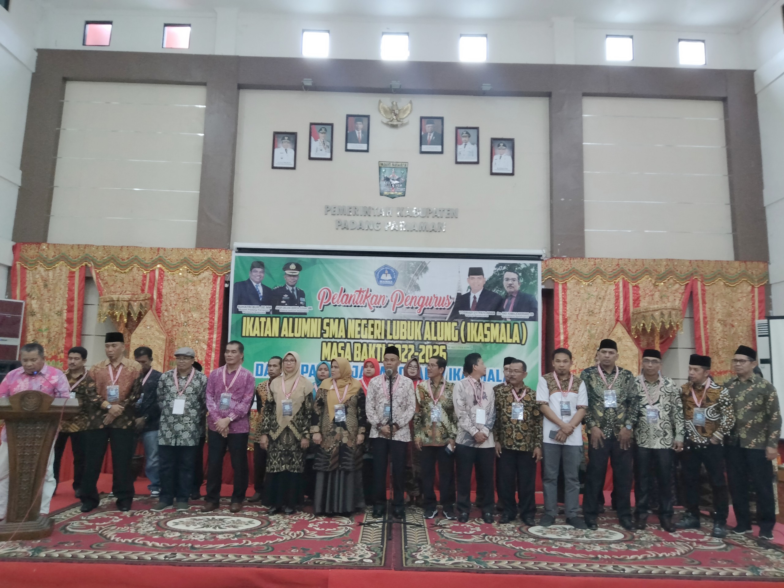 PARIKMALINTANG – Suhatri Bur, dalam kapasitas sebagai Ketua Dewan Pembina melantik Pengurus DPP IKASMALA periode 2022-2026 yang dipimpin AKBP Delvia Derita, S.kom,MM, di Aula IKK Pemda Pariaman, Parik Malintang, Sabtu (27/5).