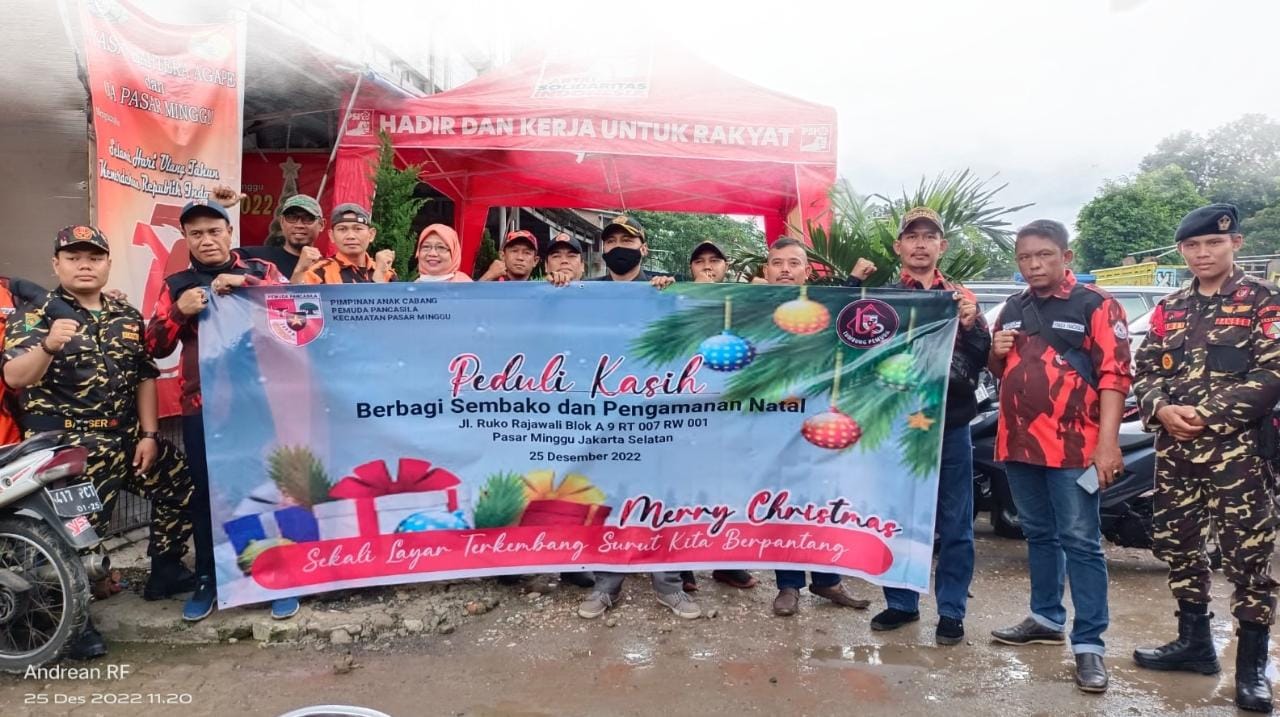 JAKARTA – Memasuki Natal dan Tahun Baru 2022 (Nataru) Pimpinan Anak Cabang Pemuda Pancasila Pasar Minggu gelar kegiatan berbagi paket sembako serta ikut pengamanan malam Natal, dengan Tema “Gerakan Peduli Kasih Berbagi Sembako dan Pengamanan Natal.” Minggu 25 Desember 2022