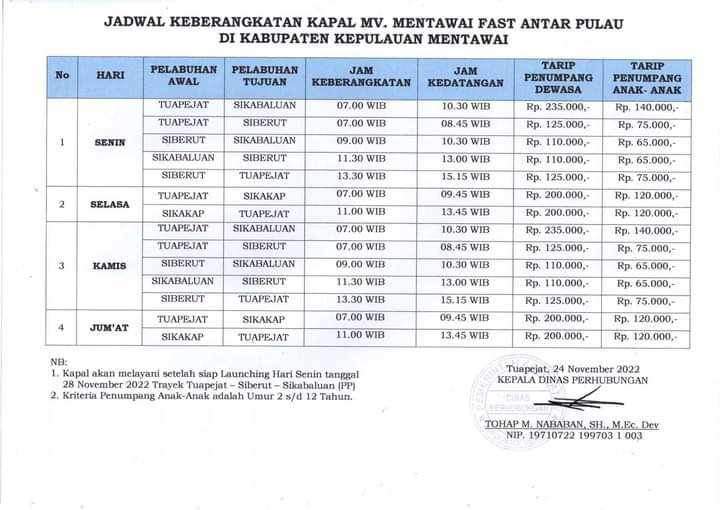 Pj. Bupati Mentawai, Martinus Dahlan mengatakan pegawai yang melakukan perjalanan dinas dalam kabupaten dapat menggunakan kapal cepat antar pulau MV. Mentawai Fast. Keberadaan MV. Mentawai Fast ini mempermudah transportasi antar pulau sehingga aktifitas pemerintah daerah di Kabupaten Kepulauan Mentawai dapat terpenuhi lebih maksimal.