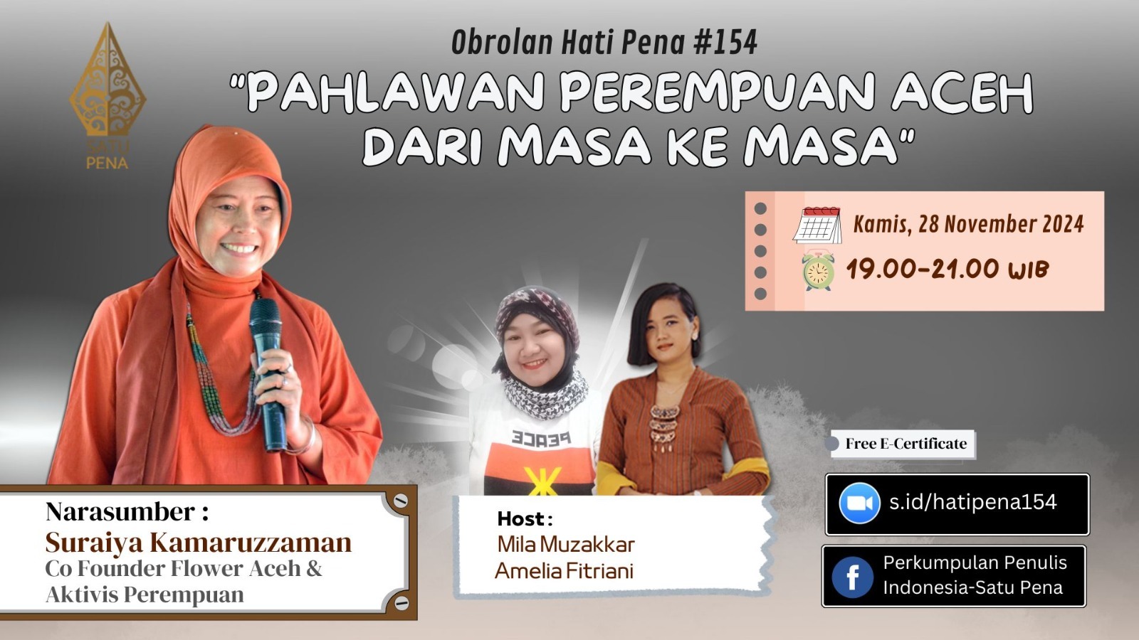 HARIANINDONESIA.ID – Perkumpulan Penulis Indonesia SATUPENA akan mendiskusikan tema pahlawan perempuan Aceh dari masa ke masa, dengan narasumber Suraiya Kamaruzzaman, aktivis perempuan dan Co-Founder Flower Aceh.