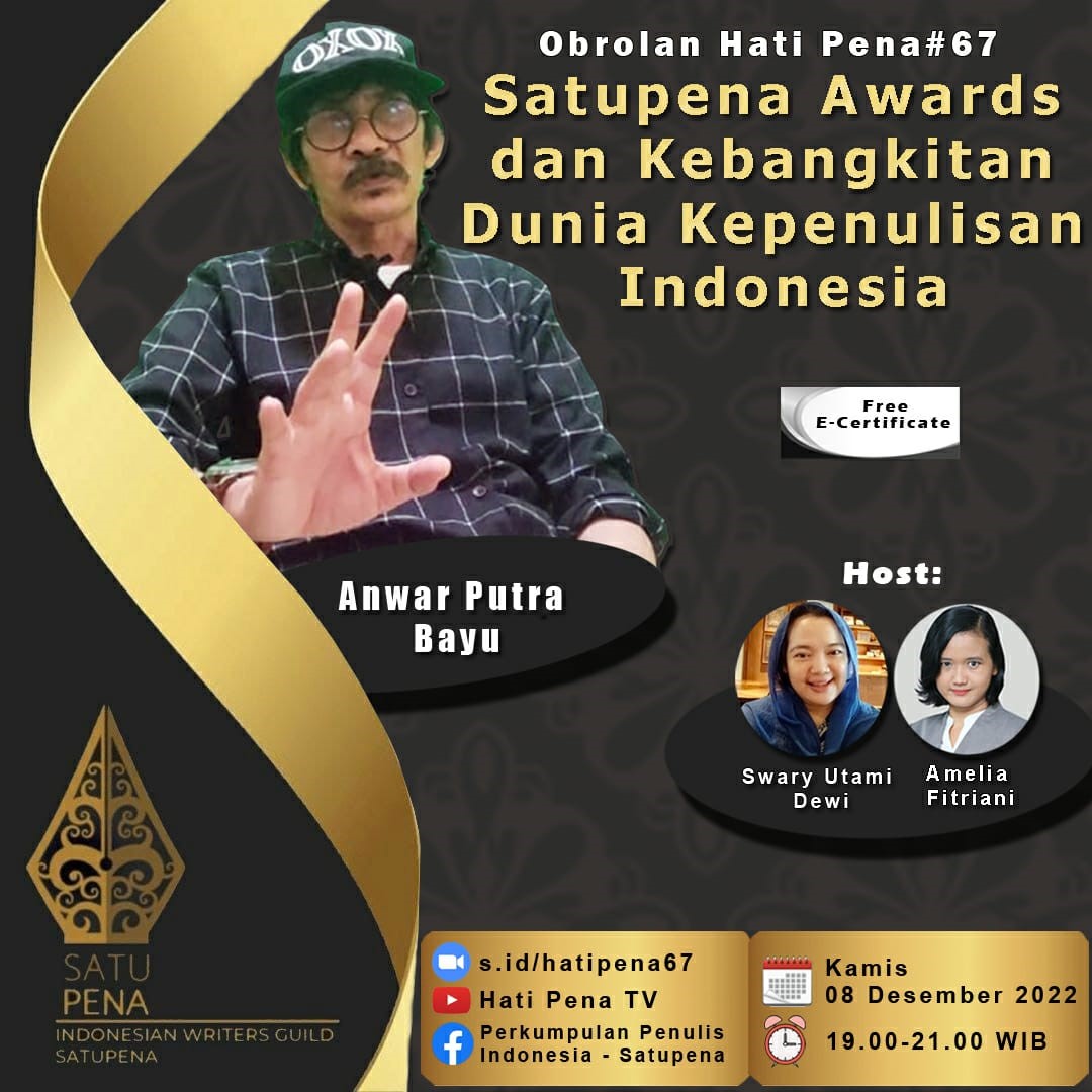 Obrolan Hati Pena #67 tentang dunia kepenulisan itu akan diadakan di Jakarta pada Kamis, 8 Desember 2022, pukul 19.00-21.00 WIB. Akan berbicara penyair dan penulis senior Anwar Putra Bayu.