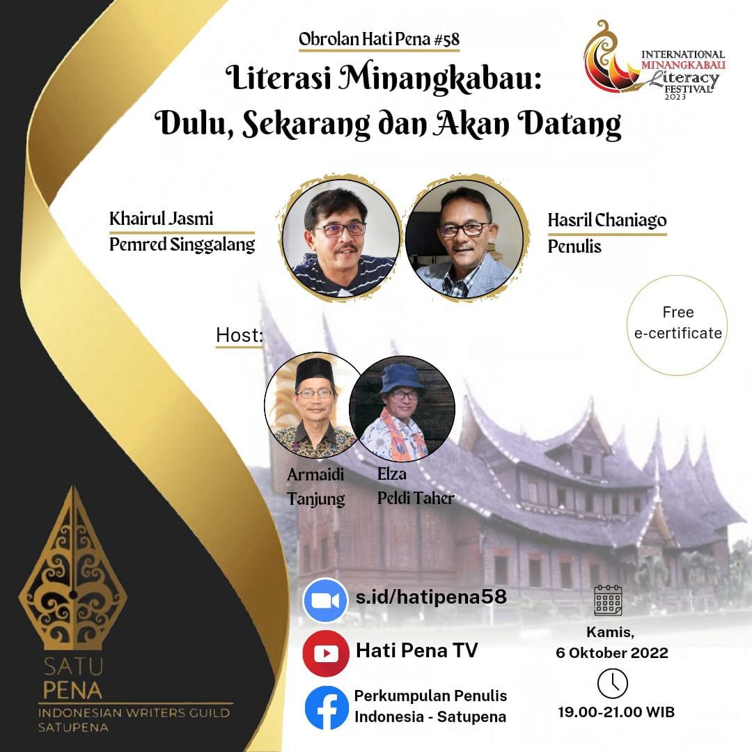 Obrolan Hati Pena #58 itu akan diadakan di Jakarta pada Kamis, 6 Oktober 2022, pukul 19.00-21.00 WIB. Akan berbicara dua budayawan Minang, Khairul Jasmi, Pemred Harian Singgalang dan Hasril Chaniago, penulis biografi dan sejarah yang amat produktif.