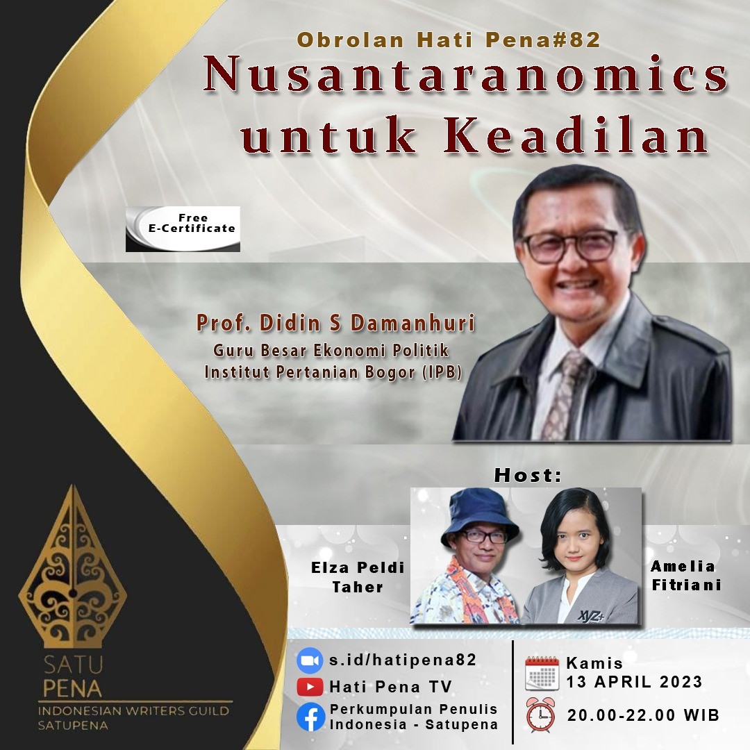 JAKARTA – Perkumpulan Penulis Indonesia, SATUPENA, akan mengadakan diskusi bertema Nusantaranomics untuk Keadilan. Nusantaranomics adalah gagasan yang dikembangkan oleh Prof. Didin S Damanhuri, Guru Besar Ekonomi Politik Institut Pertanian Bogor (IPB).
