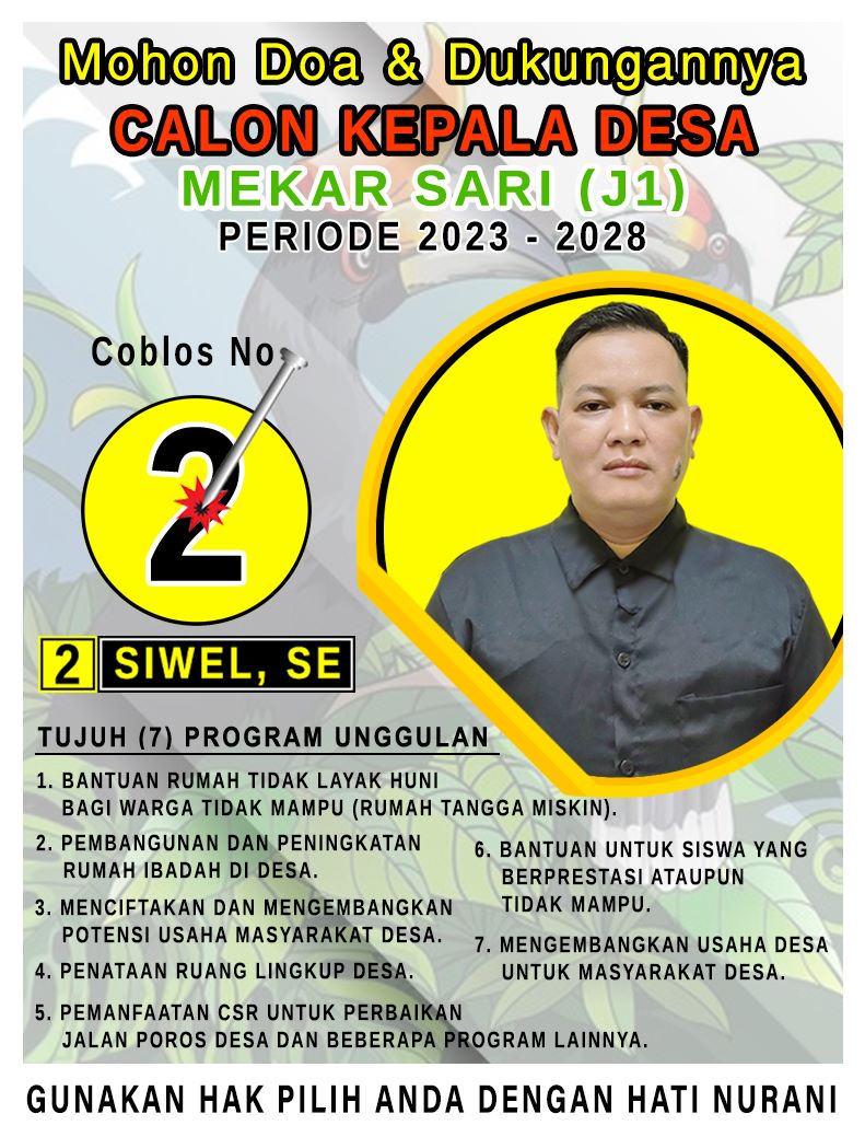 KOTIM – Pemilihan Calon Kepala Desa bakal digelar pada tanggal 23 September nanti di Kabupaten Kota Waringin Timur (Kotim) termasuk di Desa Mekar Sari. Salah satu calon kuat pada pemilihan Pilkades nanti untuk Desa Mekar Sari, Kecamatan Tualan Hulu, Kota Waringin Timur adalah Siwel.SE. Dirinya maju untuk siap mengabdi dan berkarya nyata bagi masyarakat Desa Mekar Sari.