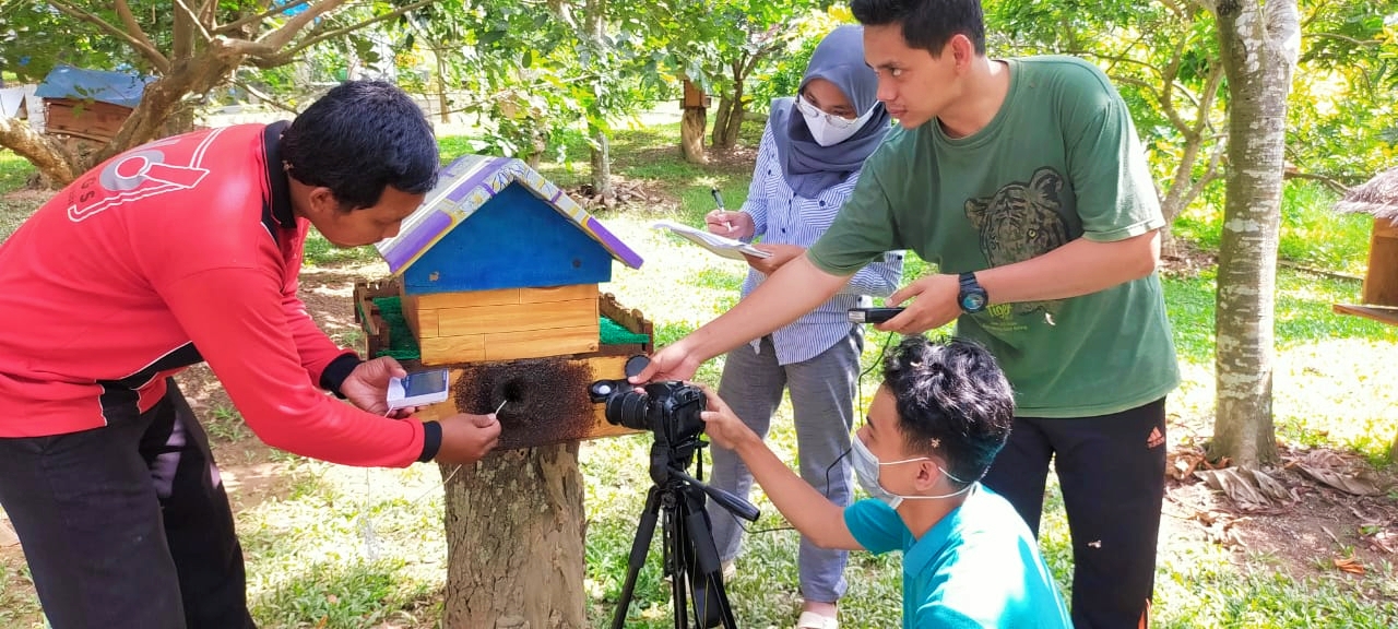 Tiga mahasiswa UNRI jurusan Biologi melakukan penelitian tentang karakter lebah madu Trigona di Taman Buah Kandi, Sawahlunto. Hasil penelitian mereka akan dianalisis di laboratoriun biologi UNRI. Foto : IYD