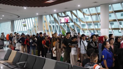 Foto pemandangan sejumlah orang yang sedang memaauki kapal penyeberangan di Pelabuhan Bakaheuni. PT ASDP Indonesia…
