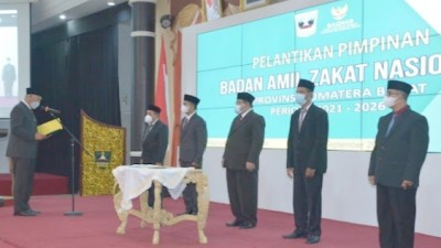 GUBERNUR Mahyeldi sedang membacakan amanat sumpah pada pelantikan Pimpinan dan Komisioner Baznas Sumbar yang sempat…