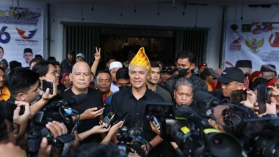 CAPRES Ganjar Pranowo memberikan penjelasan soal dukungan terhadap korban bencana gunung Marapi Sumbar, usai bersilaturahmi…