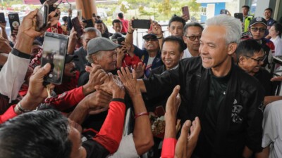 Capres Ganjar Pranowo menyalami warga Tana Toraja yang menyambutnya saat tiba di Bandara Toraja, Sabtu…