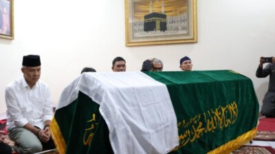 CAPRES Ganjar Pranowo terlihat berduka atas kepergian Hamka Haq, Politisi senior PDIP di kediaman almarhum,…