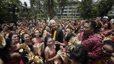 Bakal Capres Ganjar Pranowo terlihat senang diantara Penari Pendet yang disajikan untuk menunggu kedatangannya di…