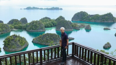 Capres Ganjar Pranowo sedang berpose di objek wisata Raja Ampat. Ganjar menyebut Papua perlu tindakan…