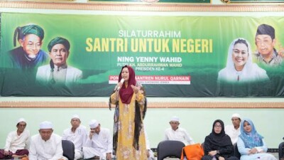 YENNY WAHID sedang memberikan sambutan di depan para Kyai dan santri Pondok Pesantren Nurul Qarnain…