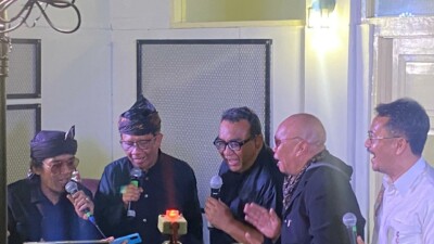 CAWAPRES Mahfud MD nyanyi bersama para seniman, budayawan dan generasi muda Bandung, Sabtu (9/12/2023). Pada…