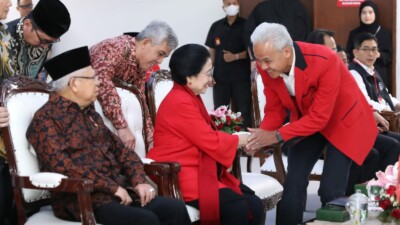 Ketua Umum PDIP Prof Dr Megawati Soekarnoputri menerima salam Capres Ganjar Pranowo yang hadir pada…