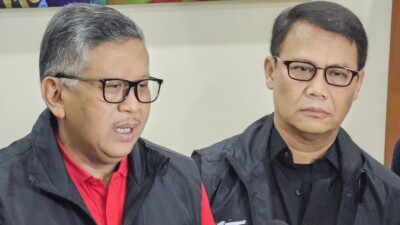 Sekjen PDIP sekaligus Sekretaris TPN Ganjar Mahfud, Hasto Kristiyanto bersama Ahmad Basarah memberikan keterangan Pers…