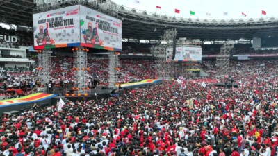 Momen Ketum PDIP Megawati Soekarnoputri menyampaikan orasi politik di depan ratusan ribu massa dan relawan…