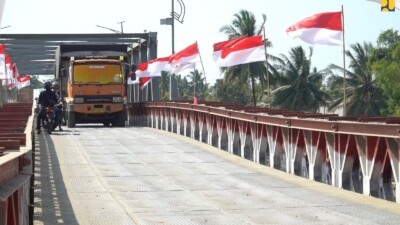 Sebuah truk secara seremoni melewati sebuah jembatan yang menandai terbukanya kembali konektivitas di tiga propinsi…