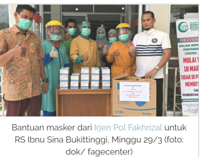 ”Jenderal ninik mamak, Pak Fakhrizal tidak mau gembar gembor tapi soal kecintaan ke Sumbar jangan ditanya, saat ini beliau tetap di Jakarta, tidak pulang ke Padang, karena mematuhi himbauan Gubernur Sumbar, tapi bantuan untuk menangkal virus corona tetap sampai ke Padang,” ujar Jefri Koyal relawan Irjen Fakhrizal saat membagikan masker ke RS Ahmad Mukhtar, Minggu (29/1) seperti ditulis situs berita online MimbarSumbar.com