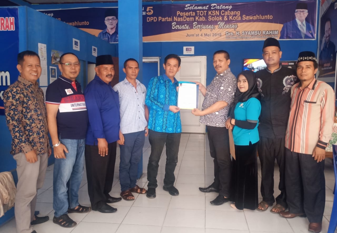 Disaksikan Ketua Dewan Pakar Partai NasDem Kabupaten Solok M Hidayat, B.Sc, SH, Ketua Dewan Pertimbangan Partai NasDem Kabupaten Solok Azwirman, Bendahara Partai, pengurus dan kader Partai NasDem Kabupaten Solok.